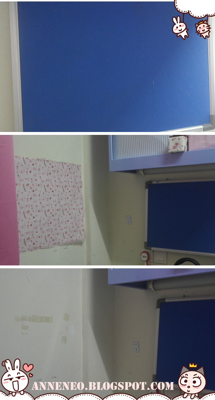 Clear all the ding ding dong dong things on the memo board, same goes to the paper on the wall ,which I used to hide the graffiti and double sided tape stain.