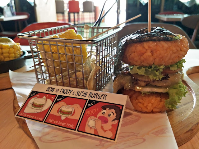 点了这个sushi burger. 里面的酱汁竟然是泰国的青咖喱酱呢,很特别吧!